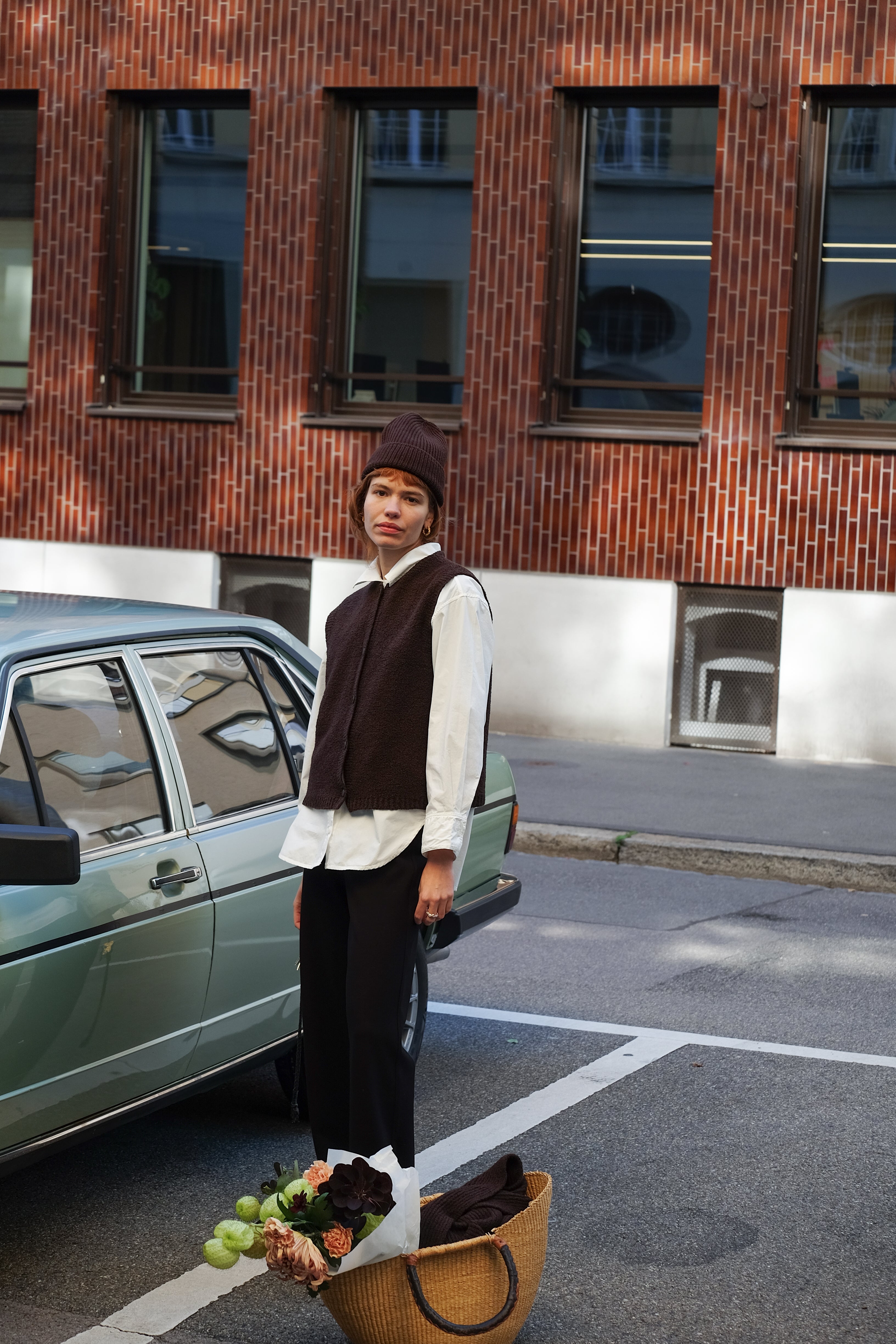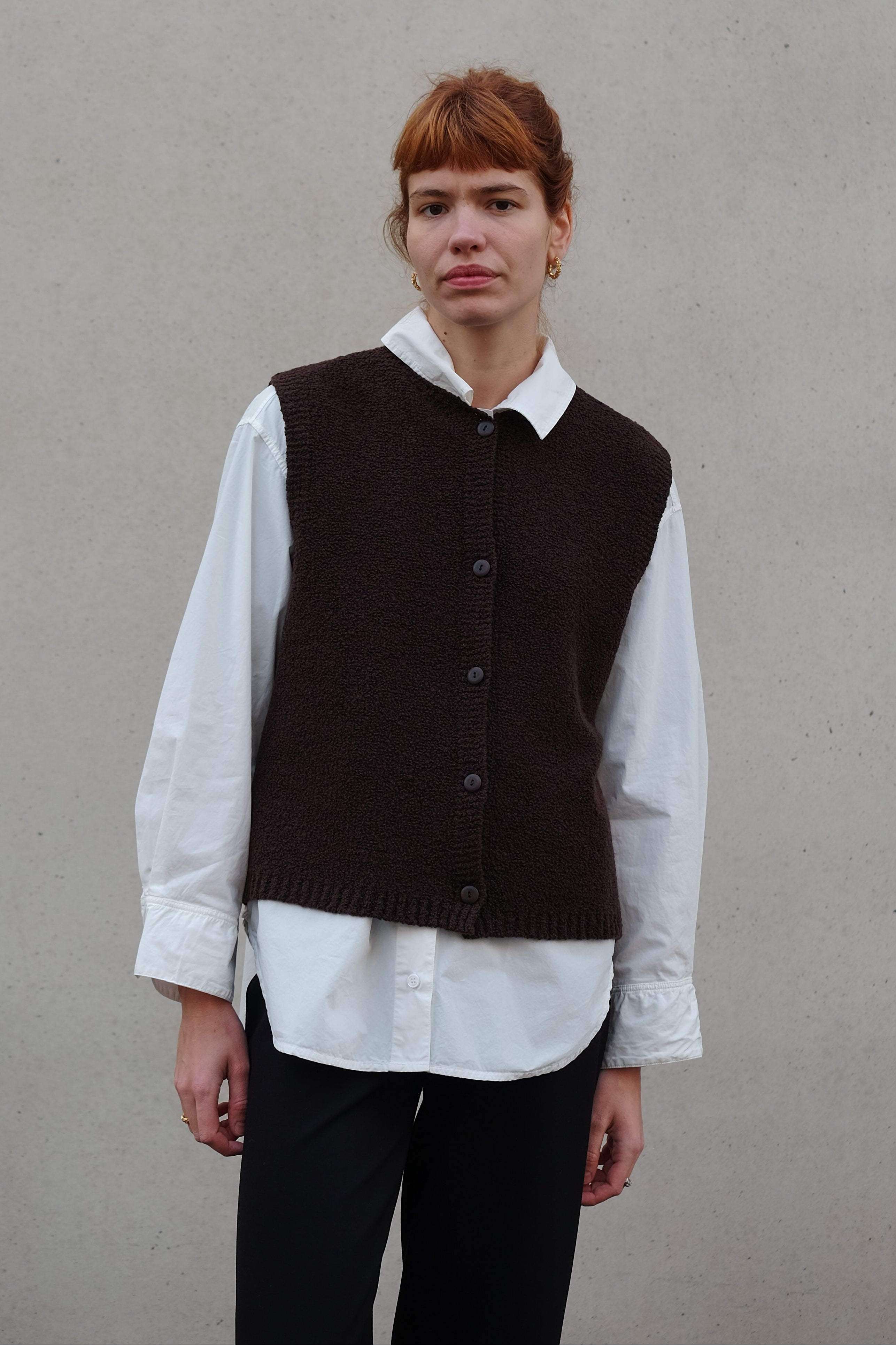 I got the bouclé vest in the color chocolate together with the oversized white shirt (like pictured) and I love the combo! It's a very simple yet unique piece that's perfect in autumn / winter. I love the dark brown shade - it looks very classy and chic!