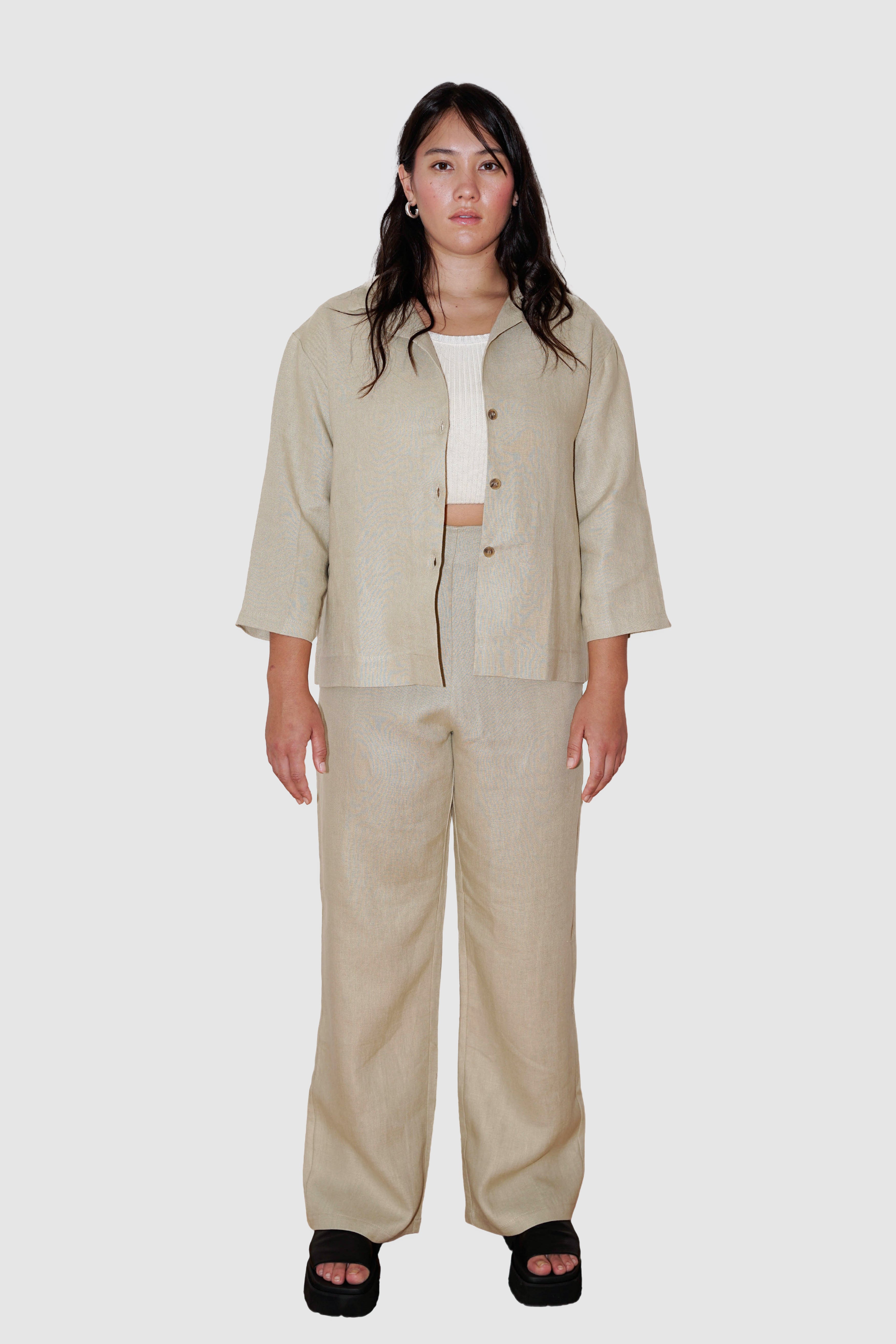 Model is wearing the Overshirt in size M/L and the Straight Trousers in size L.