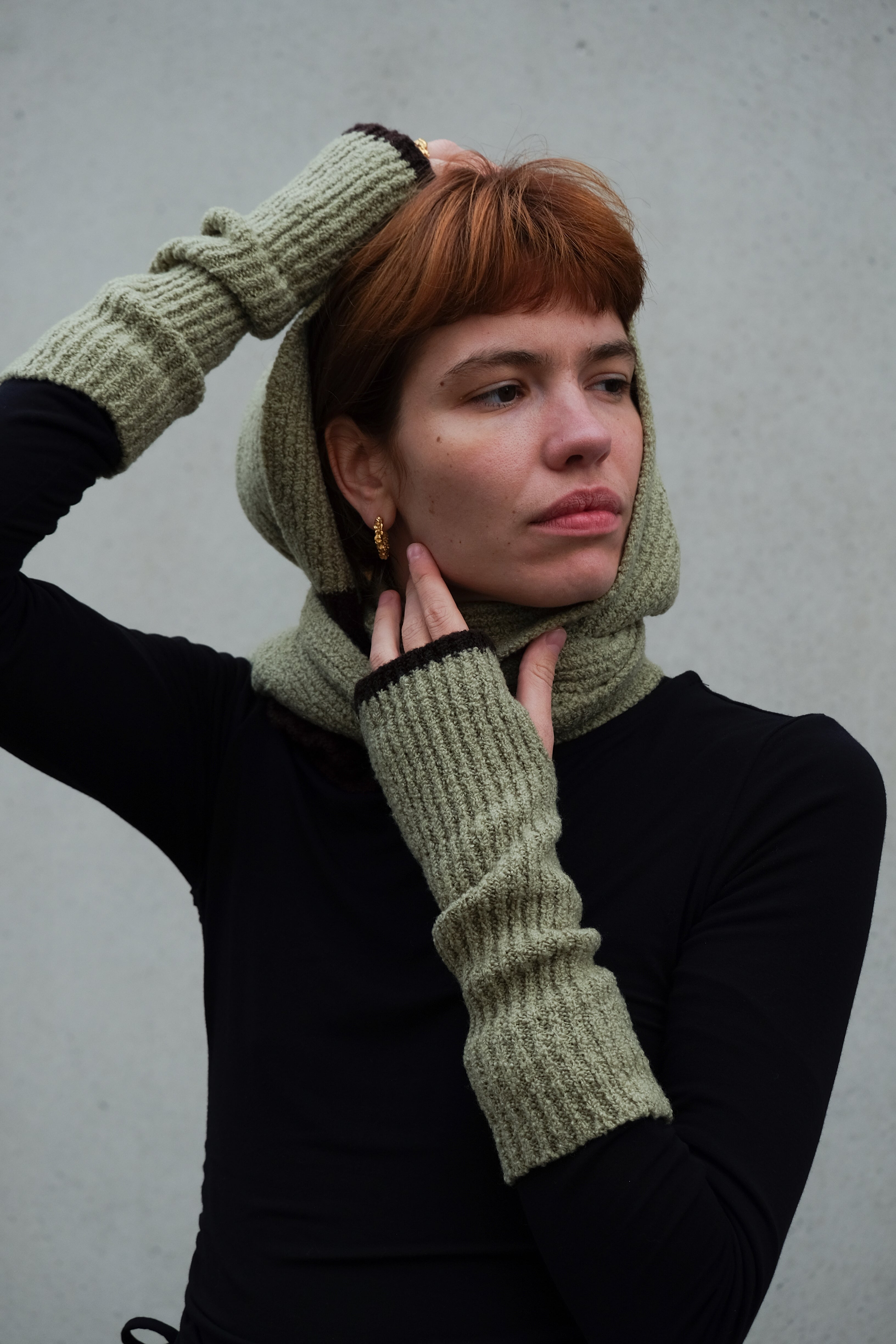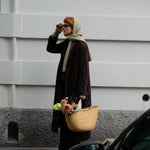 Big scarf made in Switzerland from a ultrasoft merino and cashmere blend. This winter staple will keep you warm and cozy during cold winter days. Crafted with a rib-knitted bouclé texture with a seamless finish. Two-tone with matcha and chocolate.