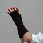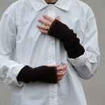 Crafted from a merino cashmere blend, these long sleeves will keep your wrists warm and cozy. Perfect for layering, this piece can be worn outside as an alternative to gloves or inside with a shirt or pullover for extra warmth. Featuring thumb slots and a seamless ribbed knit boulcé finishing. Two-tone with chocolate and brown.