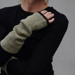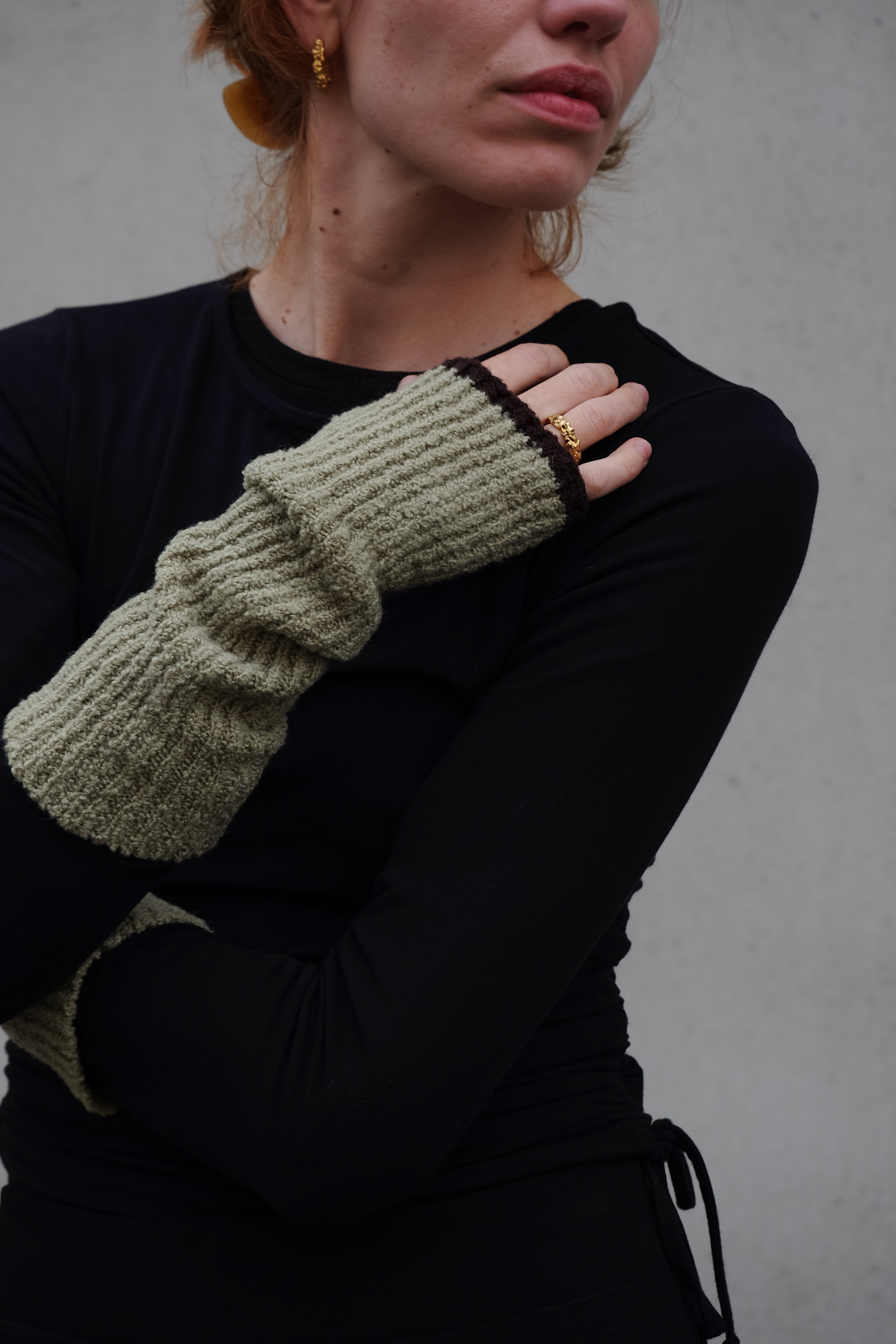 Crafted from a merino cashmere blend, these long sleeves will keep your wrists warm and cozy. Perfect for layering, this piece can be worn outside as an alternative to gloves or inside with a shirt or pullover for extra warmth. Featuring thumb slots and a seamless ribbed knit boulcé finishing. Two-tone with matcha and chocolate.