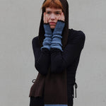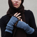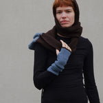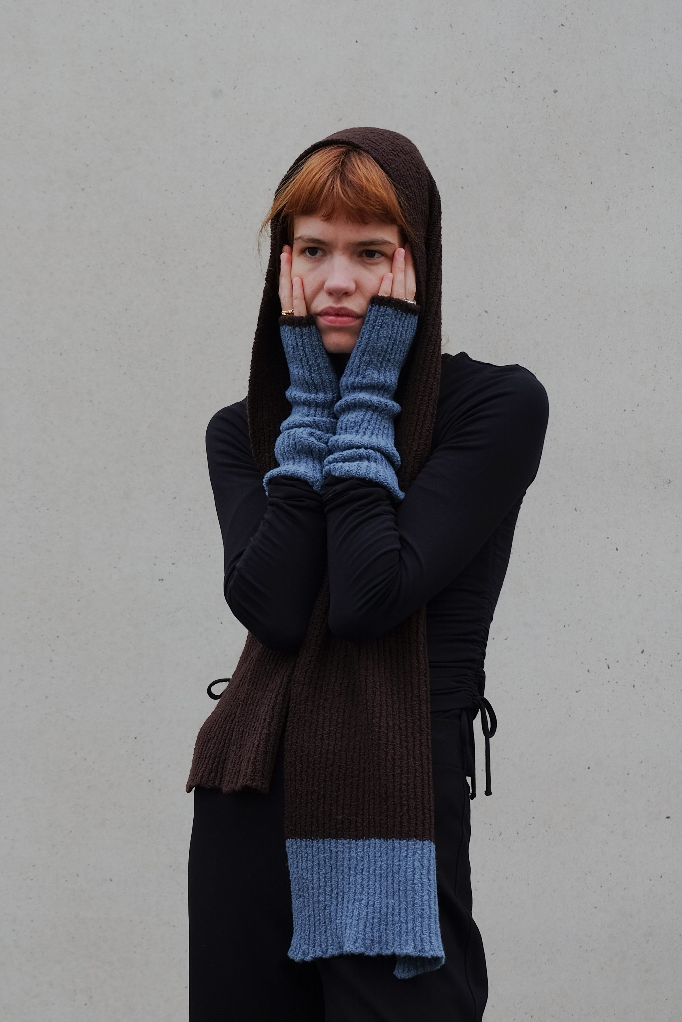 Crafted from a merino cashmere blend, these long sleeves will keep your wrists warm and cozy. Perfect for layering, this piece can be worn outside as an alternative to gloves or inside with a shirt or pullover for extra warmth. Featuring thumb slots and a seamless ribbed knit boulcé finishing. Two-tone with petrol and chocolate.