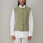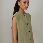 Crafted in Switzerland from a soft merino and cashmere blend, this vest combines elegance with comfort. Knitted in a unique bouclé texture, it offers a distinctive look with a seamless finish. The front closure features a classic crew neck and five coronut buttons. Its boxy fit ensures a modern silhouette, making it easy to layer over your favourite basics or wear on its own for a statement piece. Whether paired with our Oversized Shirt or the Heavy T-Shirt, this vest is designed to seamlessly transitioning from casual to refined occasions.