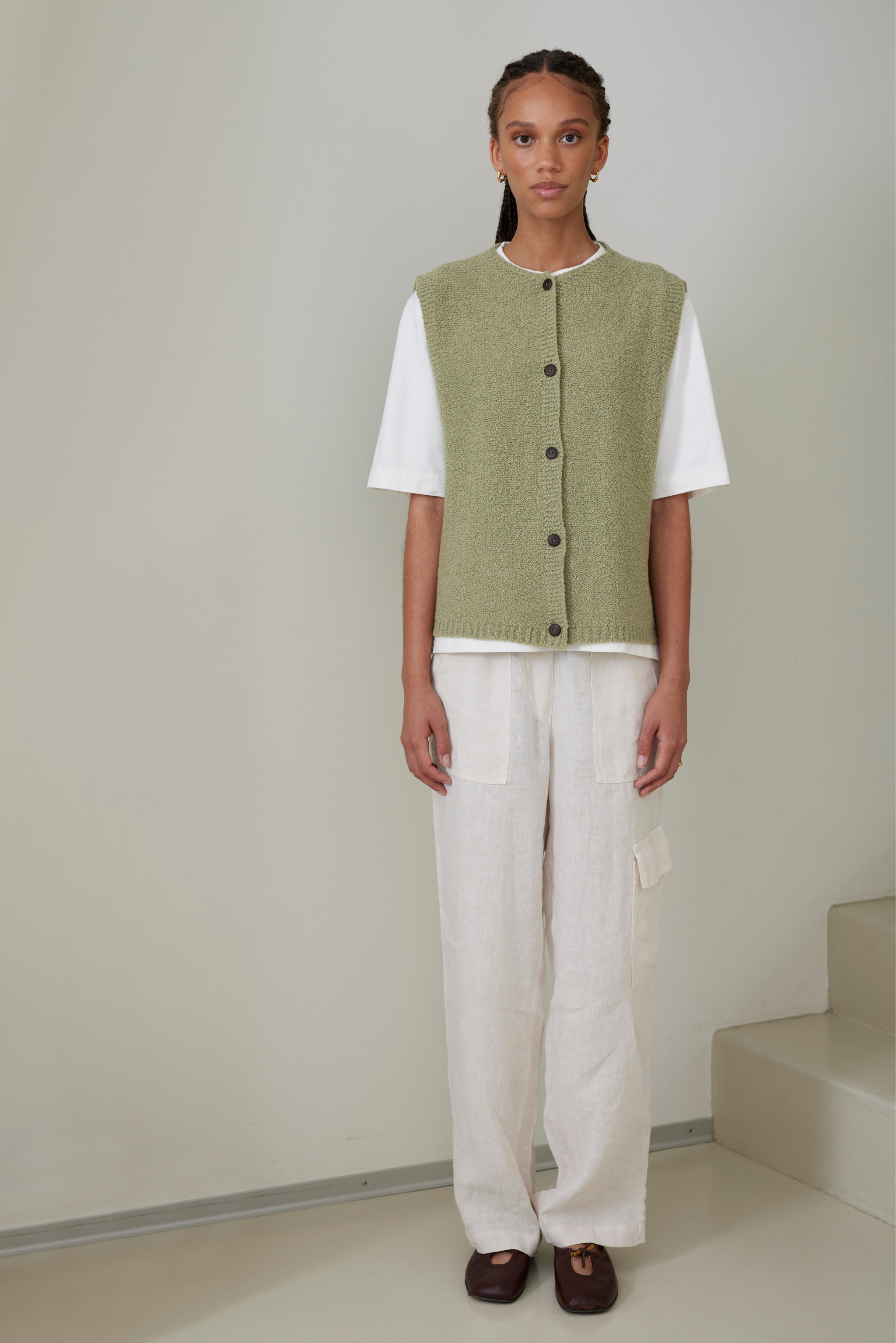 Model is 1,77m and wears the Bouclé Vest ONE SIZE and the Cargo Pants in size S/M