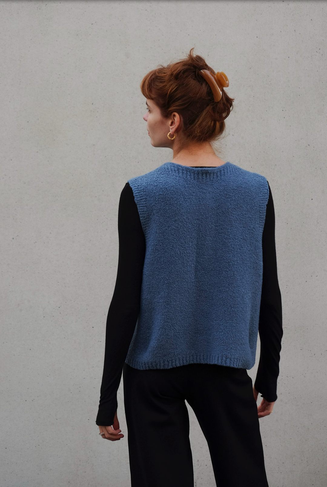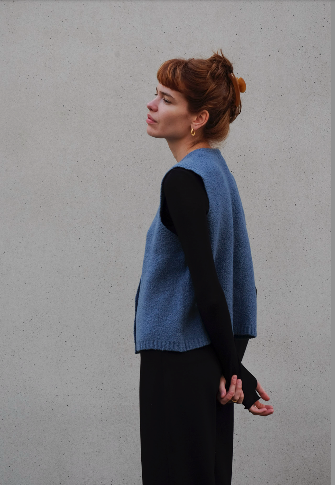 Crafted in Switzerland from a soft merino and cashmere blend, this vest combines elegance with comfort. Knitted in a unique bouclé texture, it offers a distinctive look with a seamless finish. The front closure features a classic crew neck and five coronut buttons. Its boxy fit ensures a modern silhouette, making it easy to layer over your favourite basics or wear on its own for a statement piece. Whether paired with our Oversized Shirt or the Heavy T-Shirt, this vest is designed to seamlessly transitioning from casual to refined occasions.