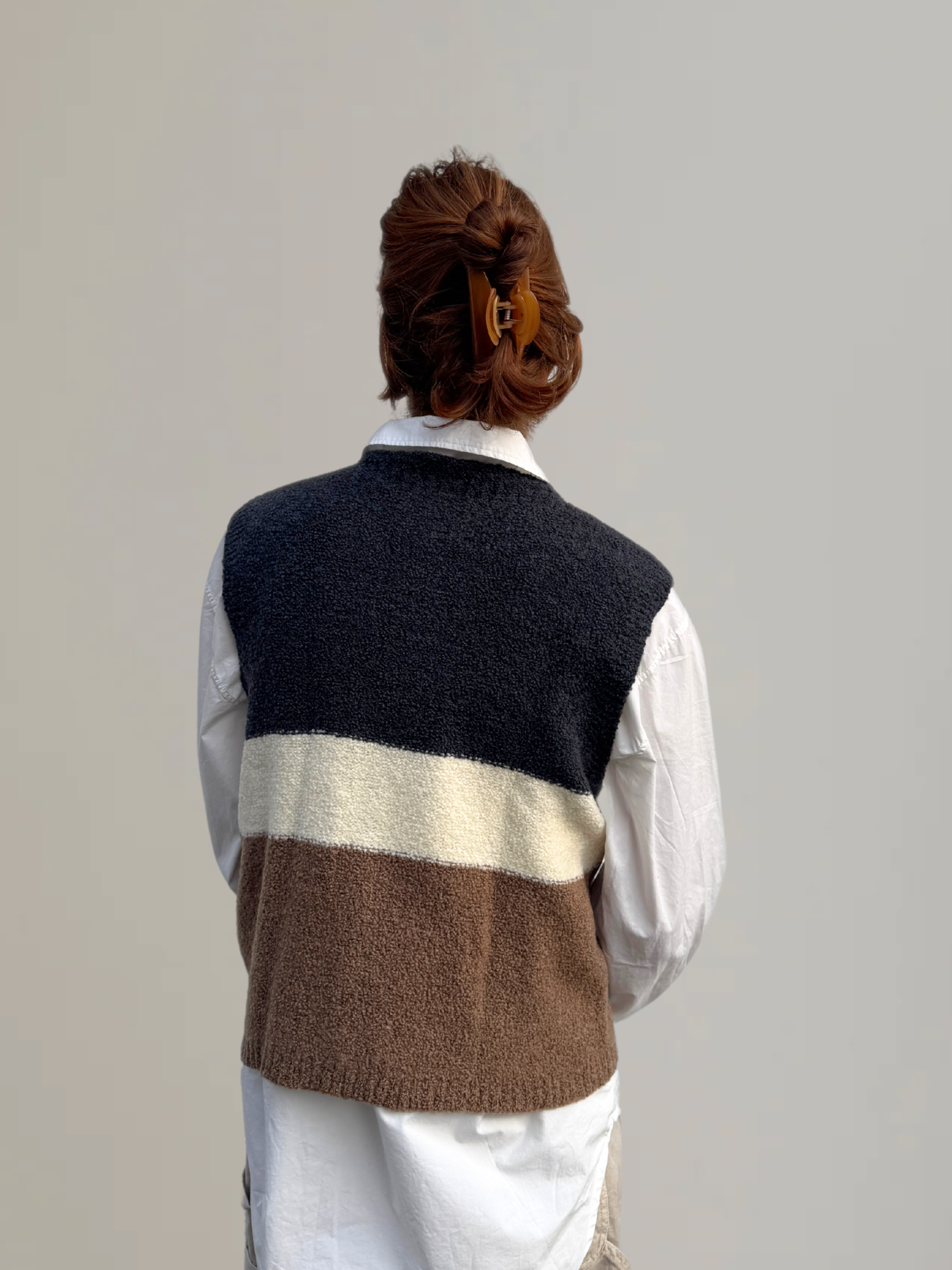 I got the bouclé vest in the color chocolate together with the oversized white shirt (like pictured) and I love the combo! It's a very simple yet unique piece that's perfect in autumn / winter. I love the dark brown shade - it looks very classy and chic!