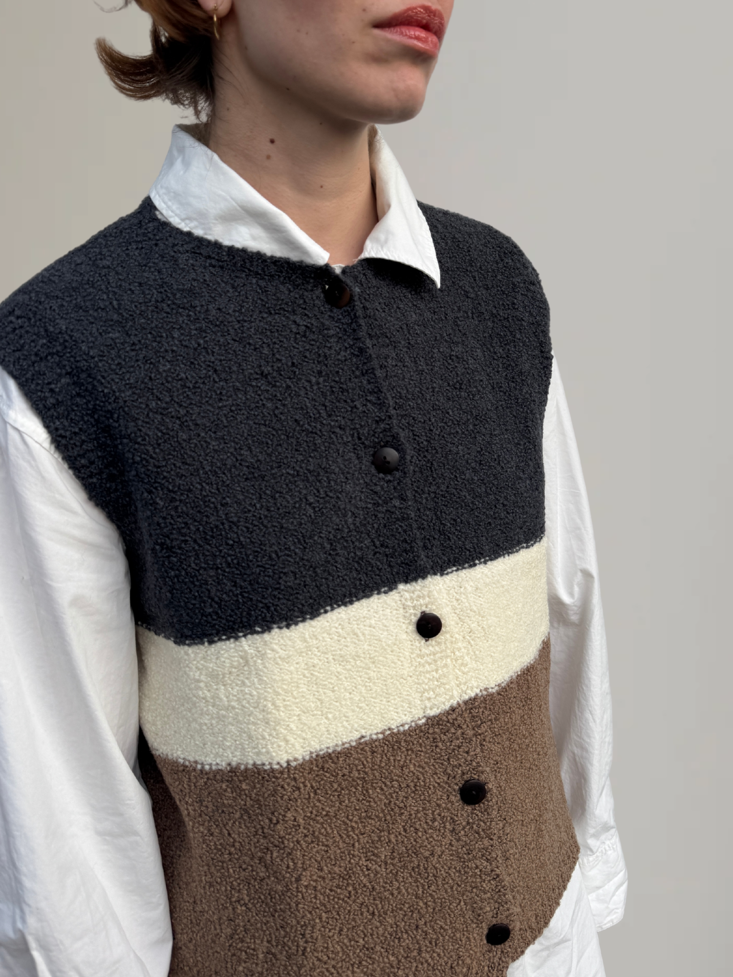 Model is 1,64m and wears the Bouclé Vest ONE SIZE with the Oversized Shirt in size S/M.