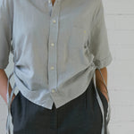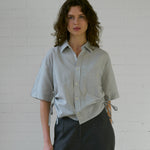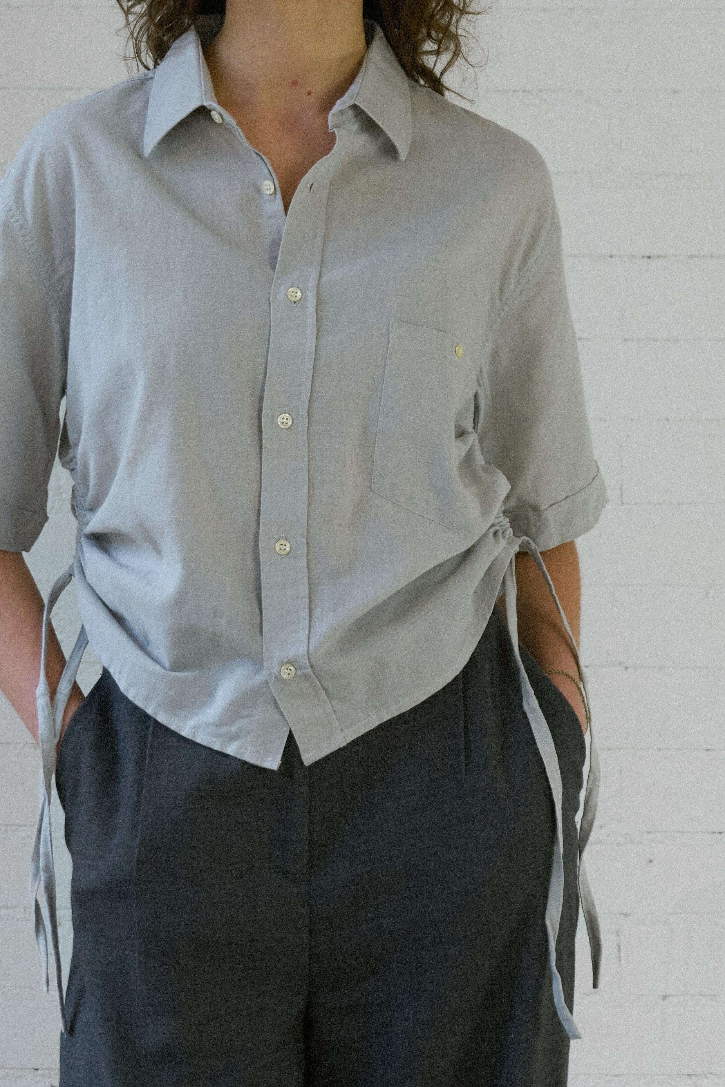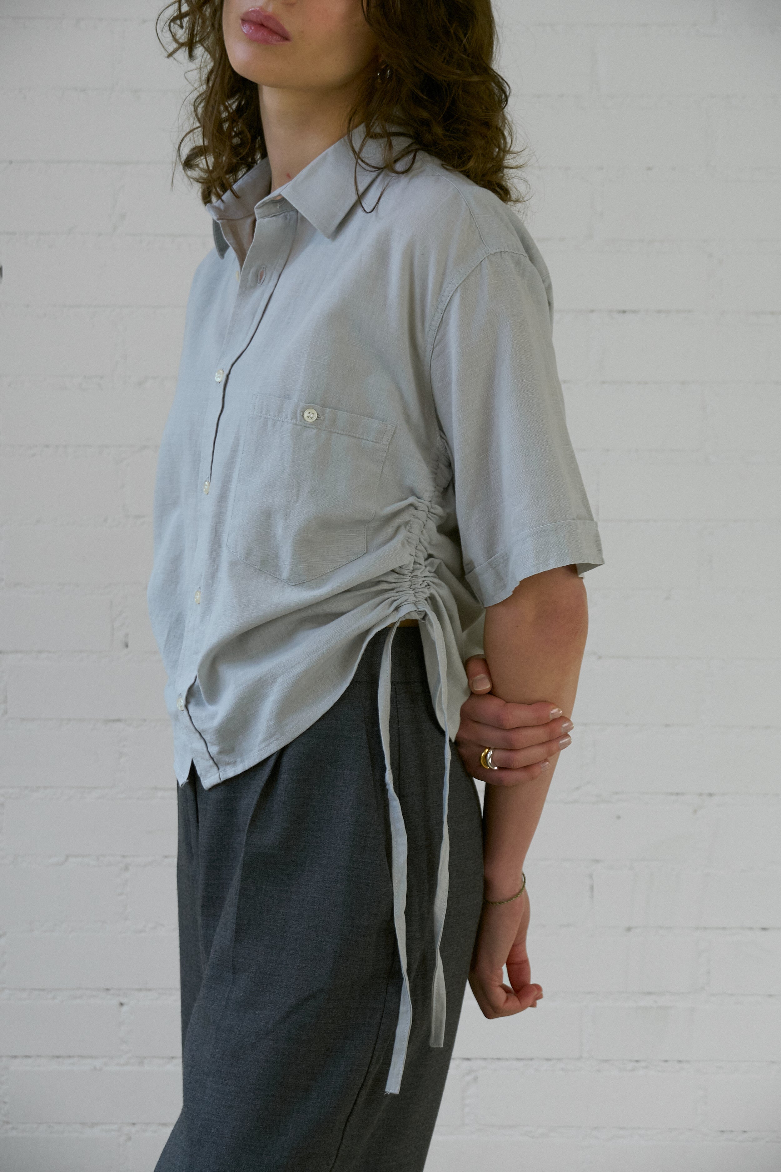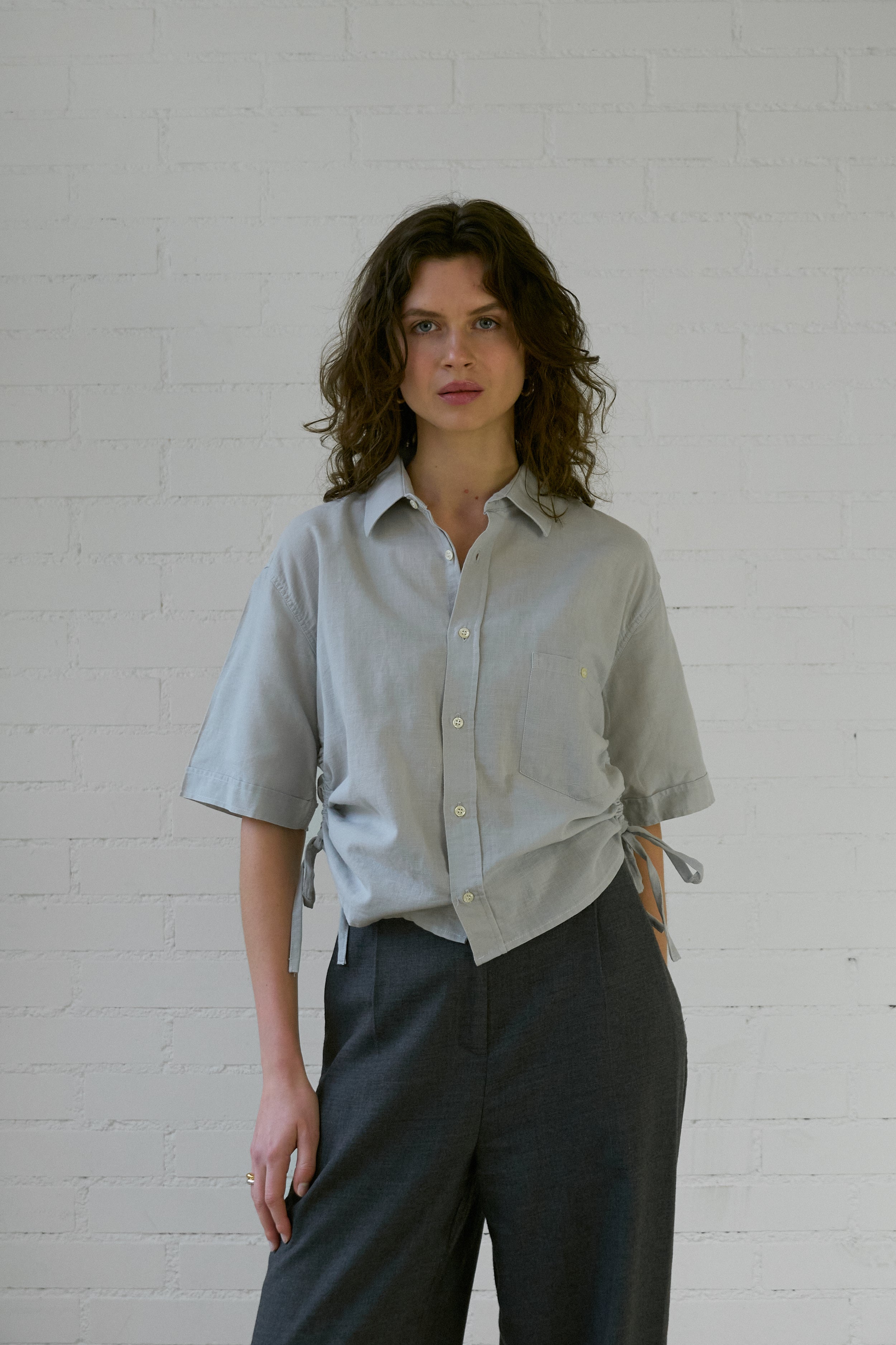 The Side Ruched Shirt is a playful revision on your favorite shirt. We've designed this vintage piece with two pulls at each side of the shirt, here you're free to play and decide how you want to wear it. Pull the strings tighter and make a bow tie or wear it relaxed without a tie.