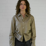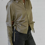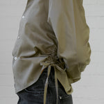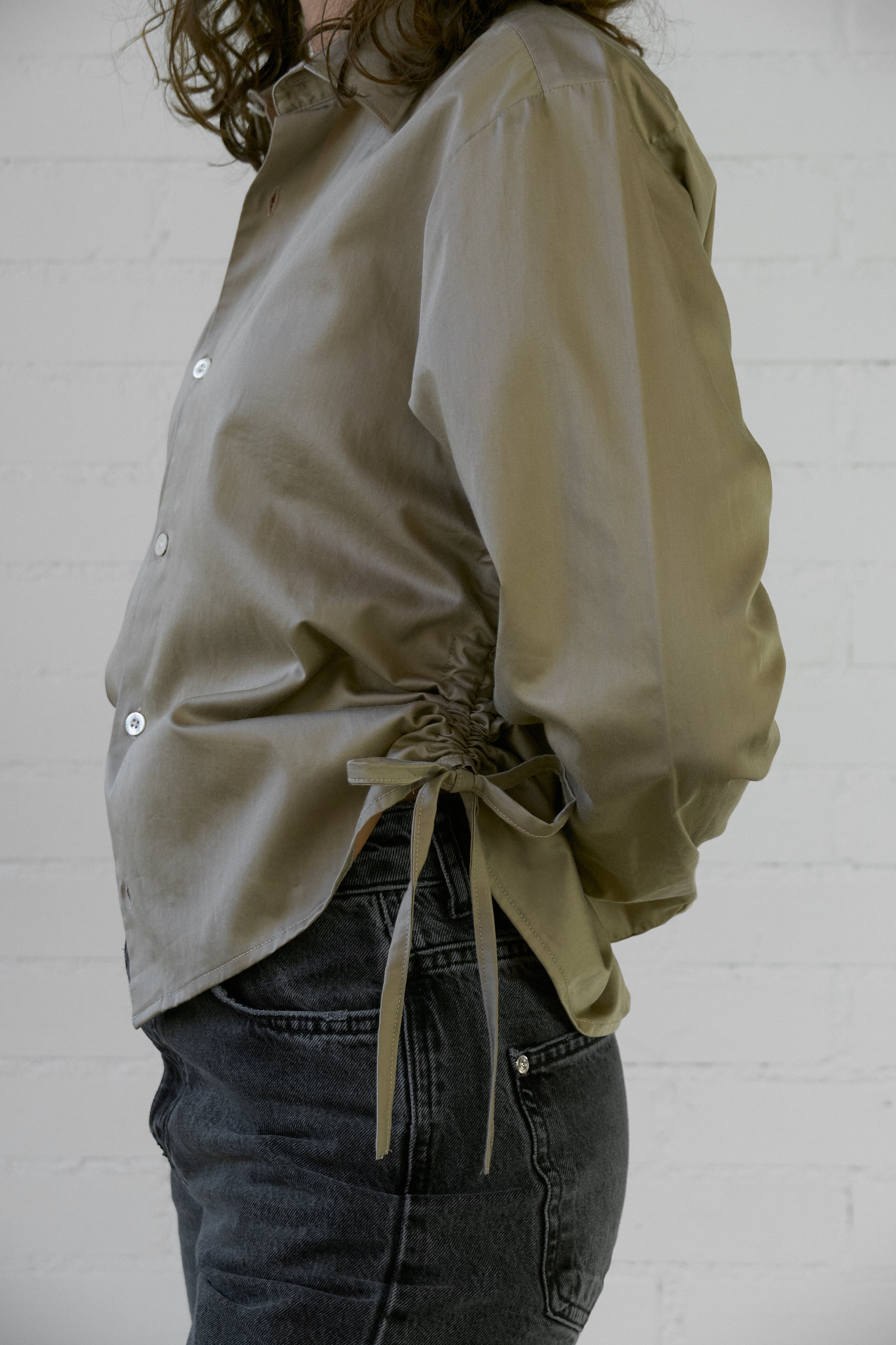 The Side Ruched Shirt is a playful revision on your favorite shirt. We've designed this vintage piece with two pulls at each side of the shirt, here you're free to play and decide how you want to wear it. Pull the strings tighter and make a bow tie or wear it relaxed without a tie.