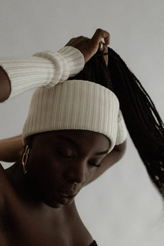 Our knit accessories are knitted in Switzerland in a small manufactory less than 30km away from our studio. We regularly visit our manufacturer to develop new products together. All pieces are knitted fully-fashioned, which is a more traditional and higher quality method than cut and sew knitwear. As it is knitted directly in the final shape, there’s no waste of yarn. Fully-fashioned knitwear is a slower, more complex and expensive method – however rewards you with a seamless, neat and high-quality finish.